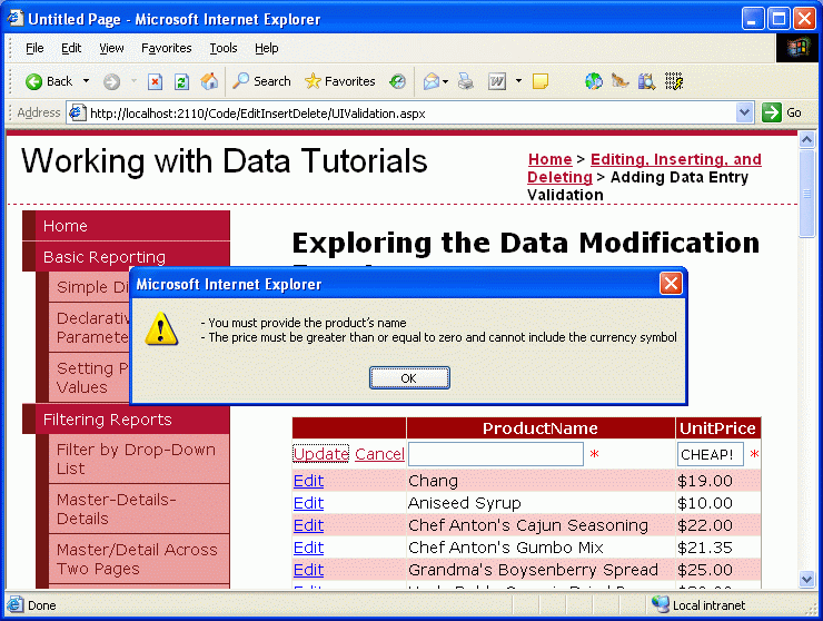 BoundField 및 CheckBoxField에 대한 기본 편집 및 삽입 인터페이스가 유용할 수 있지만 인터페이스에는 모든 종류의 유효성 검사가 부족합니다. 사용자가 필드를 생략하거나 잘못된 값 ProductName (예: -50)을 입력하는 UnitsInStock 등 데이터 입력 실수를 하면 애플리케이션 아키텍처의 깊이 내에서 예외가 발생합니다. 이 예외는 이전 자습서에서 설명한 대로 정상적으로 처리할 수 있지만, 사용자 인터페이스를 편집하거나 삽입하는 데는 사용자가 이러한 잘못된 데이터를 처음부터 입력하지 못하도록 하는 유효성 검사 컨트롤이 포함되는 것이 이상적입니다.