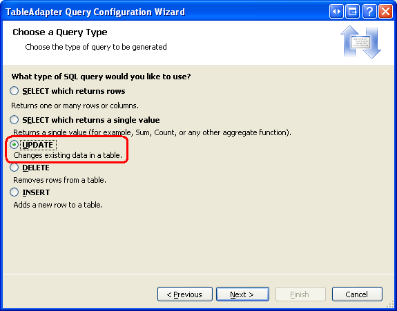 형식화된 데이터 세트를 열고 디자이너에서 머리글을 마우스 오른쪽 단추로 클릭하고 CategoriesTableAdapter 상황에 맞는 메뉴에서 쿼리 추가를 선택하여 TableAdapter 쿼리 구성 마법사를 시작합니다. 이 마법사는 TableAdapter 쿼리가 데이터베이스에 액세스하는 방법을 묻는 것으로 시작합니다. SQL 문 사용을 선택하고 다음을 클릭합니다. 다음 단계에서는 생성할 쿼리 형식을 묻는 메시지를 표시합니다. 테이블에 새 레코드를 추가하는 쿼리를 만들고 있으므로 UPDATE를 Categories 선택하고 다음을 클릭합니다.