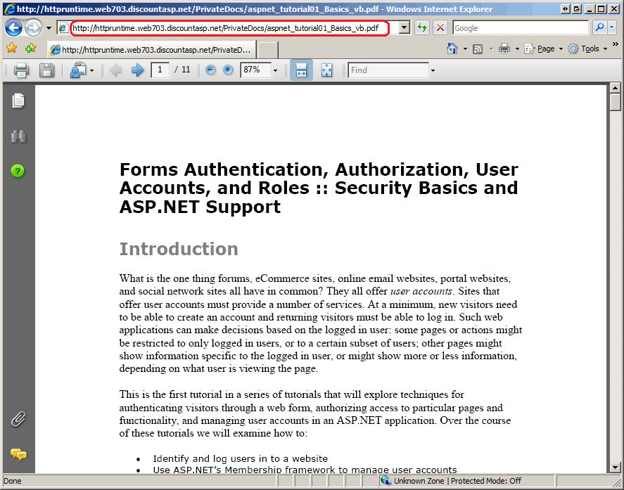 ASP.NET 개발 서버를 사용하여 사이트를 방문하여 브라우저의 주소 표시줄에 있는 PDF 파일 중 하나에 대한 직접 URL을 입력합니다. 이 자습서와 연결된 웹 사이트를 다운로드한 경우 URL은 다음과 같습니다. http://localhost:portNumber/PrivateDocs/aspnet_tutorial01_Basics_vb.pdf
