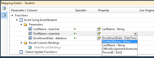 동일한 매핑 세부 정보 창에서 함수를 UpdateUpdateStudent 저장 프로시저에 매핑하고(저장 프로시저에 대해 했던 것처럼 에 대한 FirstNameInsert 매개 변수 값으로 지정 FirstMidName 했는지 확인) Delete 함수를 저장 프로시저에 DeletePerson 매핑합니다.