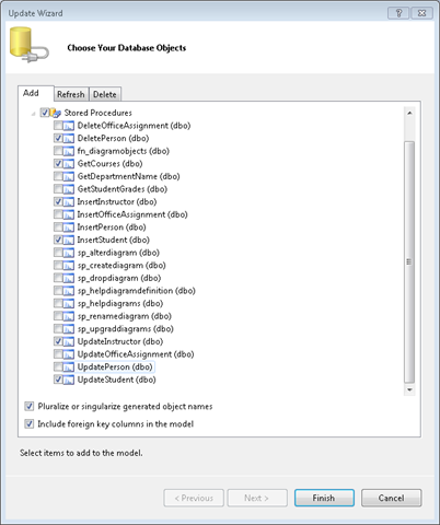 데이터베이스 개체 선택 대화 상자의 추가 탭에서 저장 프로시저를 확장하고 새로 만든 저장 프로시저 및 DeletePerson 저장 프로시저를 선택한 다음 마침을 클릭합니다.