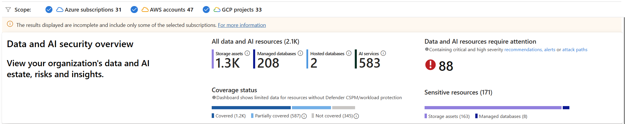 데이터 보안 대시보드 기능은 구독 수준에서 사용하도록 설정됩니다. 대시보드 정보는 구독의 데이터 및 AI 리소스와 구독에서 사용하도록 설정된 계획을 기반으로 합니다.