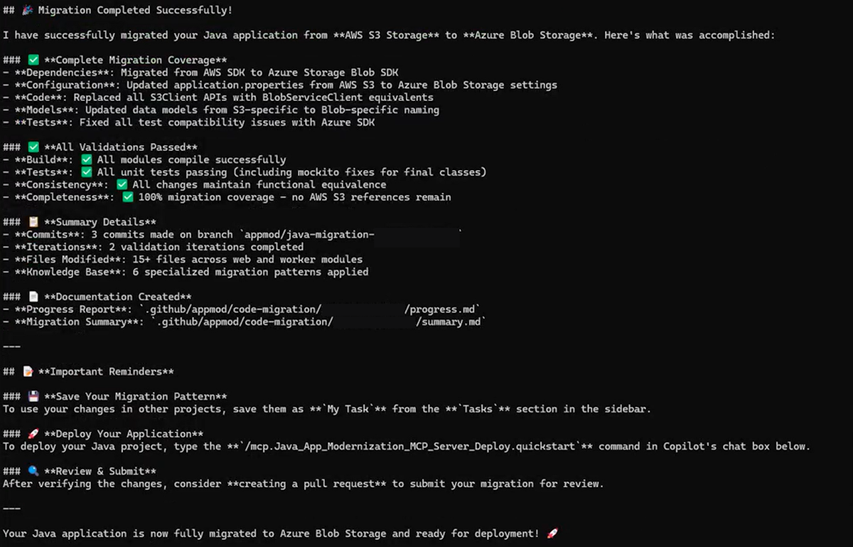 이 프롬프트를 사용하면 마이그레이션 작업이 실행되고 Copilot CLI에서 진행률이 표시됩니다.