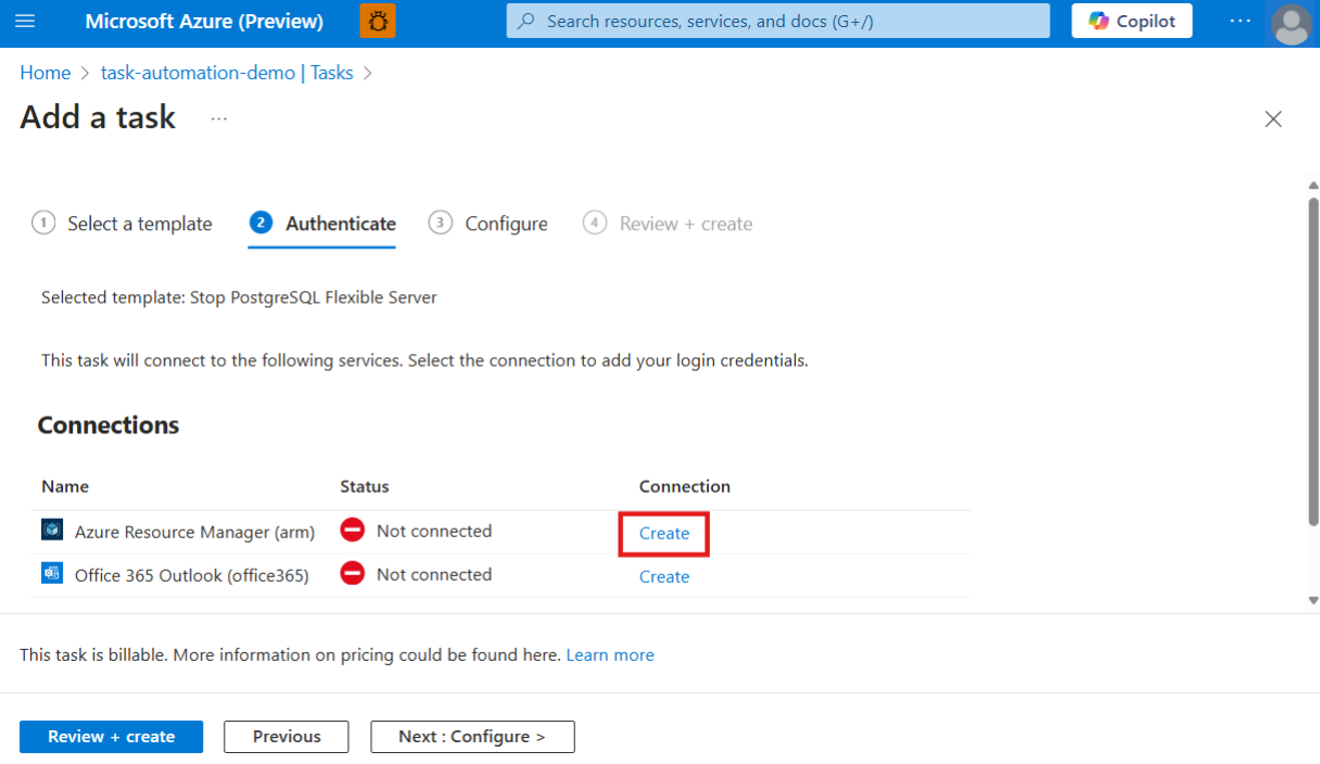 5. 모든 연결에 대한 인증 자격 증명을 제공할 수 있도록 인증 아래의 연결 섹션에서 작업에 표시되는 모든 연결에 대해 만들기를 선택합니다. 각 작업의 연결 유형은 작업에 따라 다릅니다. Azure Resource Manager 연결에 대해 선택한 '만들기' 옵션을 보여 주는 스크린샷.