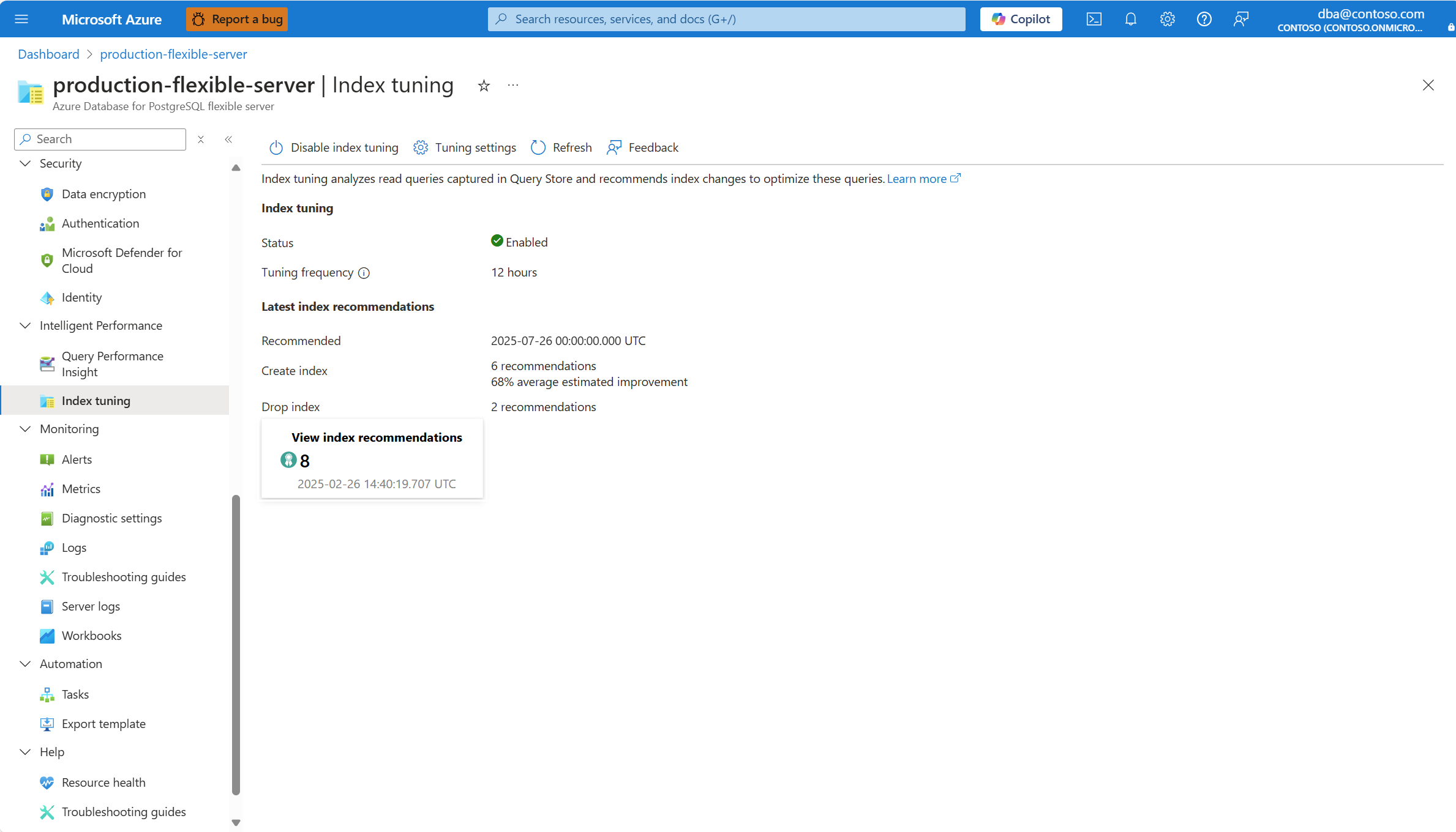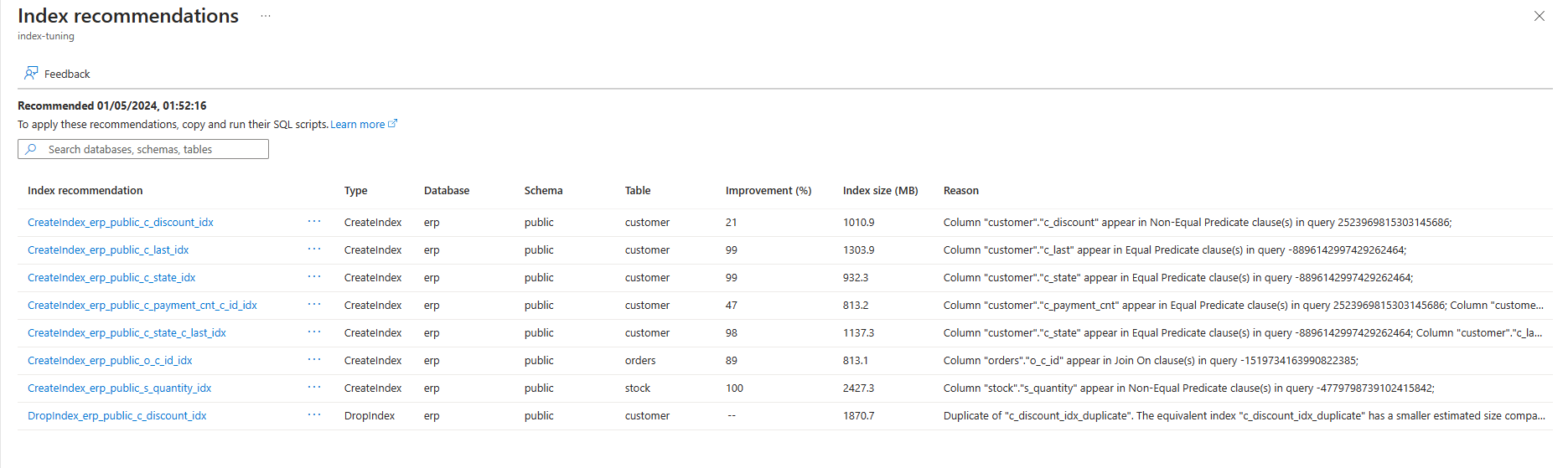 az postgres flexible-server index-tuning list-recommendations 명령을 통해 기존 서버에서 인덱스 튜닝으로 생성된 인덱스 튜닝 권장 사항을 나열할 수 있습니다.