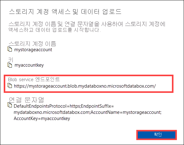 2. 스토리지 계정 액세스 및 데이터 업로드 대화 상자에서 Blob 서비스 엔드포인트Storage 계정 키를 복사합니다. Blob 서비스 엔드포인트에서 https:// 및 후행 슬래시를 생략합니다.