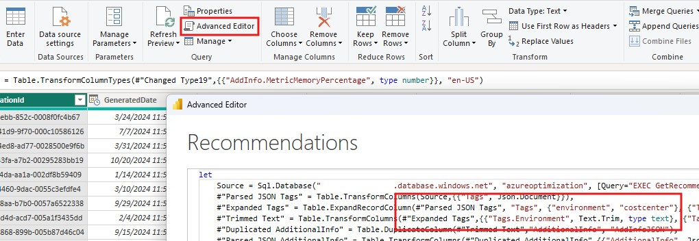 이 보고서는 리소스에 태그가 적용된 environment 시나리오를 위해 작성되었습니다. 변경하거나 새 태그를 추가하려면 [데이터 변환] 메뉴를 다시 열지만 이제 [데이터 변환] 하위 작업을 선택합니다. 새 창이 열립니다. "고급 편집기" 옵션에서 다음을 선택하는 경우 데이터 변환 논리를 편집하고 태그 처리 지침을 업데이트할 수 있습니다.