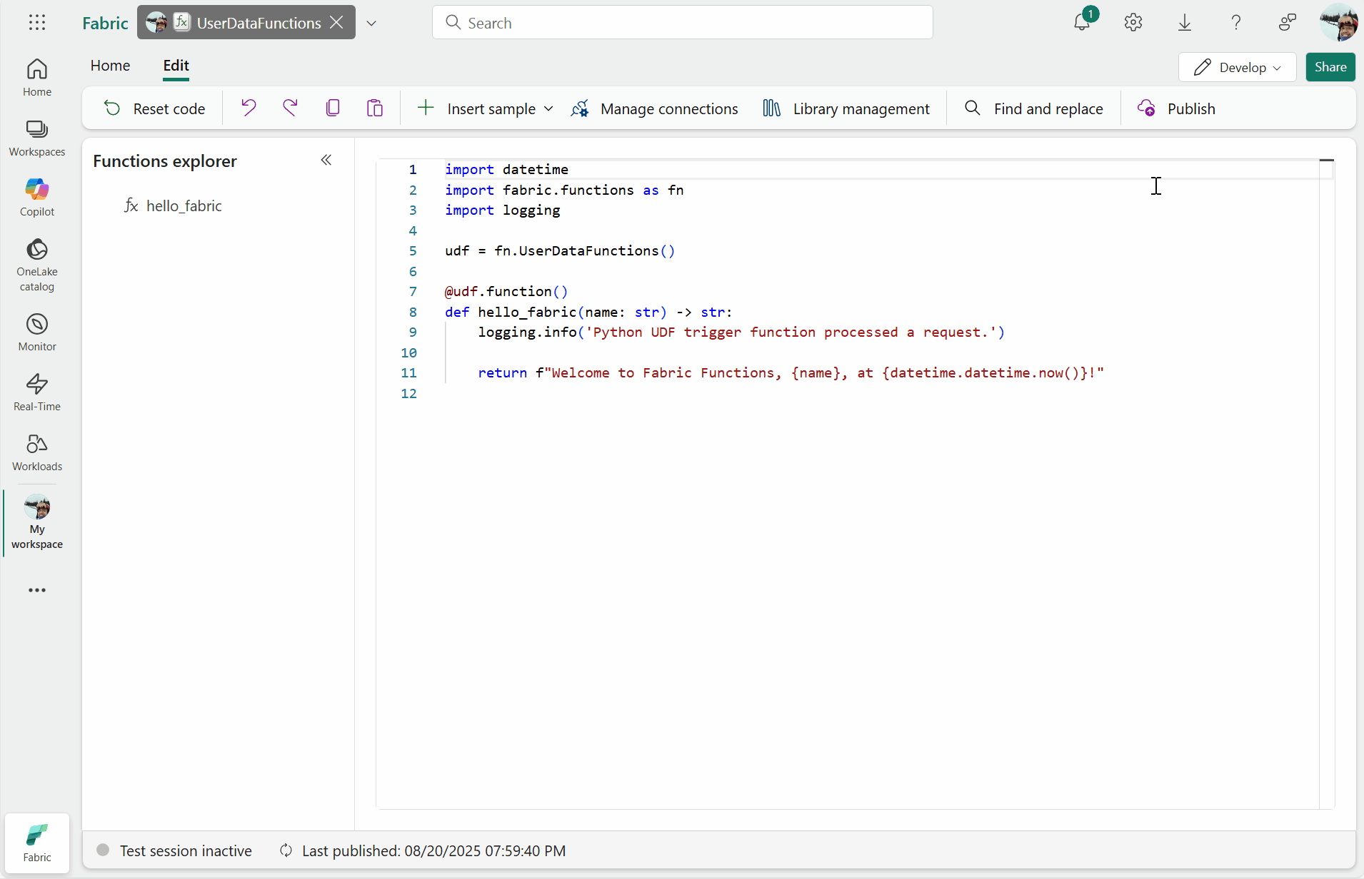 hello_fabricPython 함수 템플릿을 만듭니다. Functions 탐색기에는 게시되고 호출할 준비가 된 모든 함수가 표시됩니다.hello_fabric함수가 게시되면 Functions 탐색기의 함수 목록에서 실행할 수 있습니다.