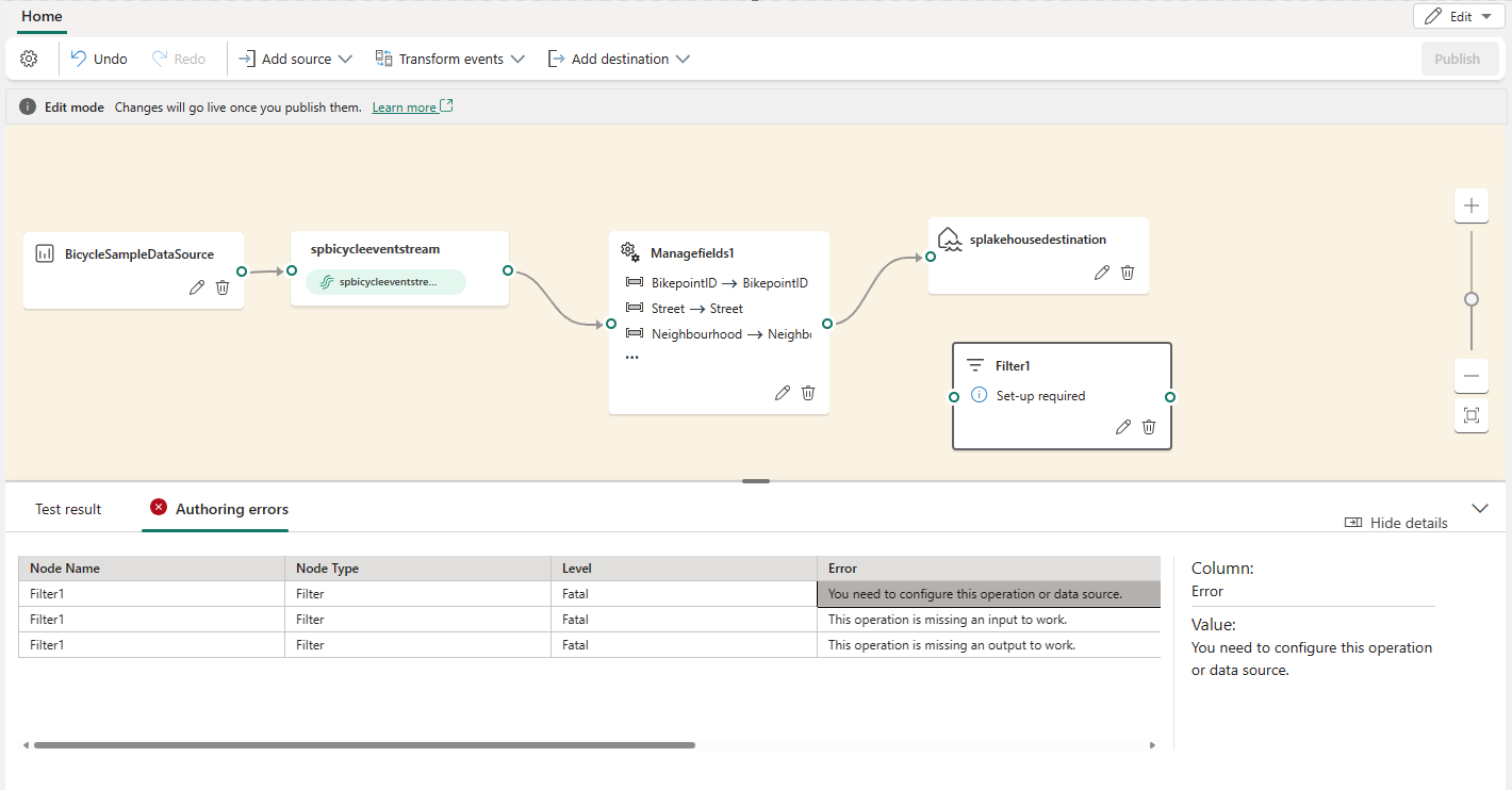 이벤트 처리 편집기( 편집 모드의 캔버스)를 사용하여 데이터를 다양한 대상으로 변환할 수 있습니다. 편집 모드를 입력하여 데이터 스트림에 대한 스트림 처리 작업을 디자인합니다.