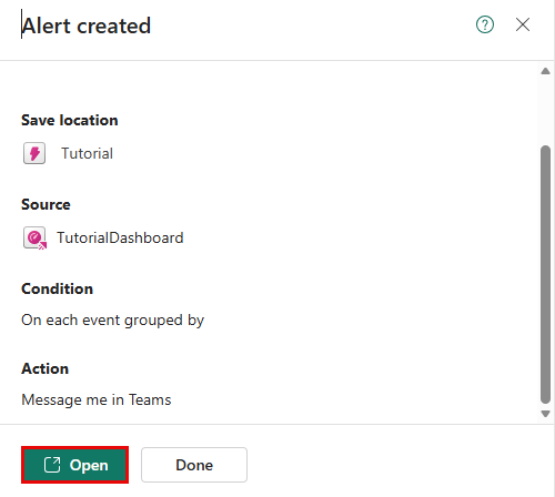 분야 가치 세부 정보 규칙 이름 자전거 개수 많은 경우 경고 모니터 모든 쿼리 실행 5분 상태 확인 각 이벤트를 기준에 따라 그룹화하여* 그룹화 필드 No_Bikes 언제 BikepointID 상태 보다 큼 값 30 발생 빈도 조건이 충족 될 때마다 조치 작업 선택 개인에게 메시지 보내기 에서 Teams 사용자 이름 표제 활성화 장치 경보 자전거 통행량 경보 Notes '높은 자전거 수 경고'에 대한 조건이 충족되었습니다. 저장 위치 Workspace 자습서 리소스가 있는 작업 영역 항목 자습서 선택하고생성합니다. 성공 메시지가 표시되면 열기를 선택합니다.