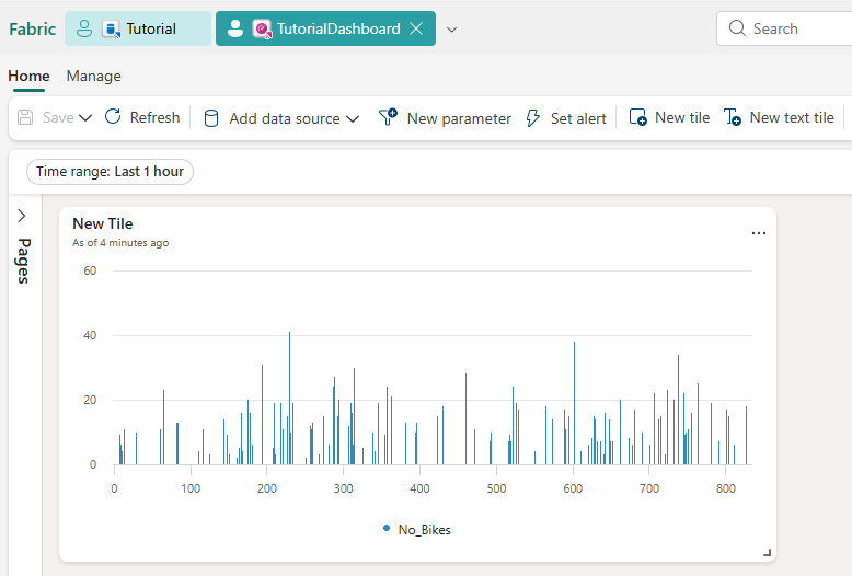 AggregatedData | sort by BikepointID | render columnchart with (ycolumns=No_Bikes,xcolumn=BikepointID)대시보드>선택하여새 Real-Time 대시보드를 선택합니다.