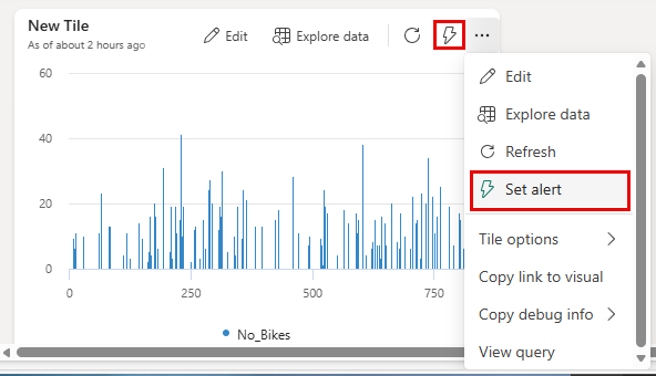 데이터에서 특정 조건이 충족될 때 알림을 받도록 Real-Time 대시보드 타일에 Activator 경고를 설정할 수 있습니다. 모든 스테이션의 자전거 수가 특정 임계값을 초과하면 알림을 받으려면 자전거 위치 맵 타일에 경고를 설정합니다.
