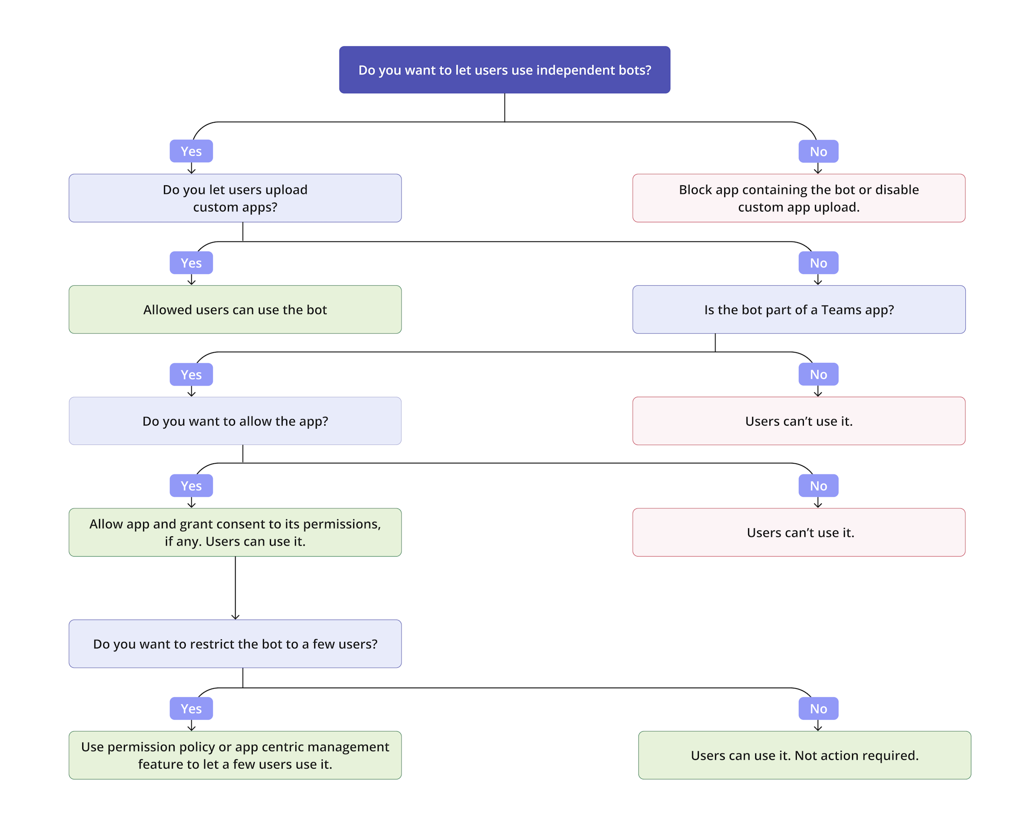 - 관리자가 organization 앱을 허용하는 경우 Teams 앱의 일부인 모든 봇이 작동합니다.