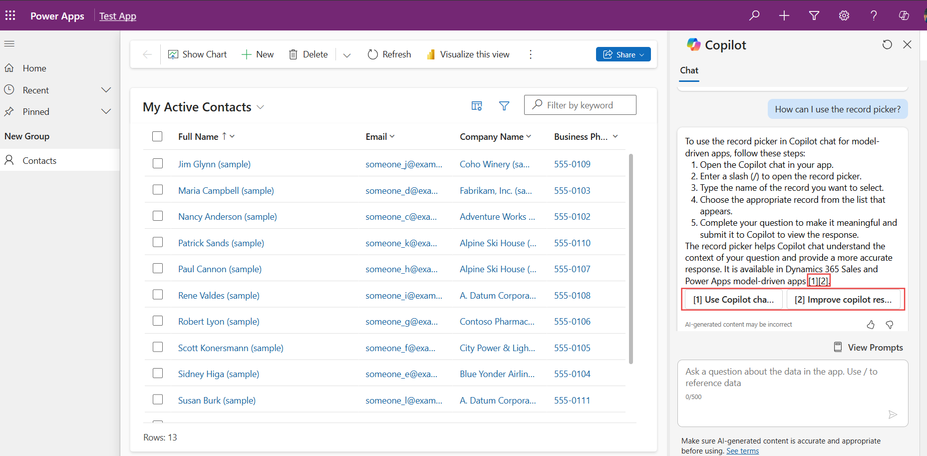Copilot Studio에 추가 참조 자료 원본을 추가할 수 있습니다. 예를 들어, https://learn.microsoft.com/power-apps/를 참조 자료로 추가하여 Power Apps 설명서와 같은 외부 공개 웹 사이트에 대한 링크를 추가하면 Copilot 채팅에서 Power Apps에서 앱을 만드는 것과 관련된 질문에 답할 수 있습니다. 또 다른 예는 조직의 내부 지식을 문서로 업로드하여 Copilot 채팅이 앱 데이터의 일부가 아닌 관련 쿼리에 응답할 수 있도록 하는 것입니다.