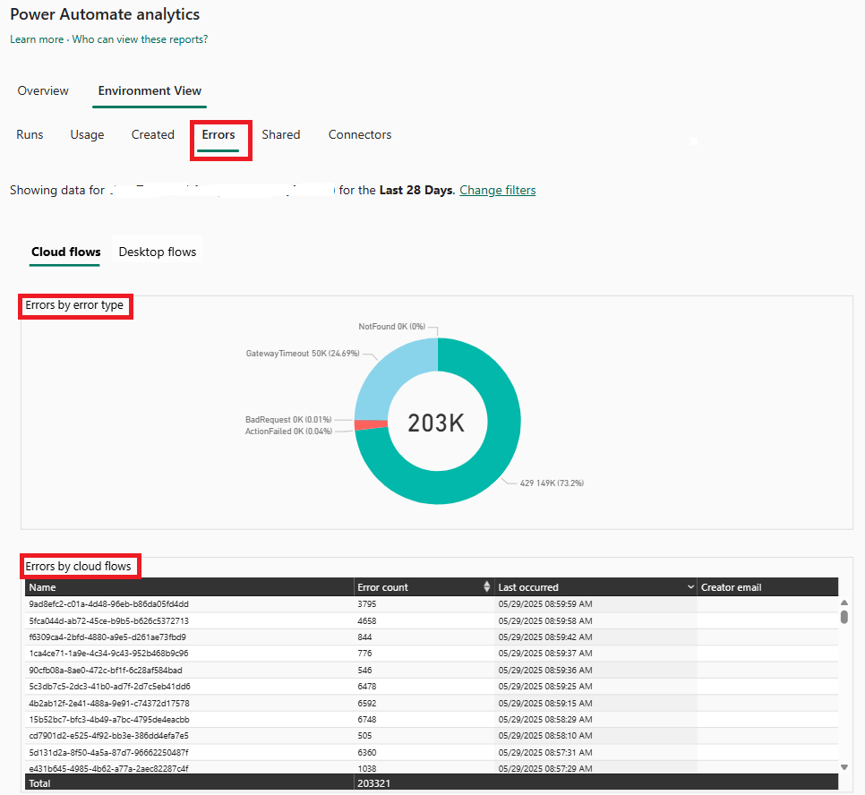 이 보고서는 반복 오류 유형 및 오류 수, 작성자 전자 메일 주소, 마지막 발생 시간 및 각 플로우에 대한 작성자 전자 메일 주소와 같은 세부 사항에 대한 통찰력을 제공합니다.