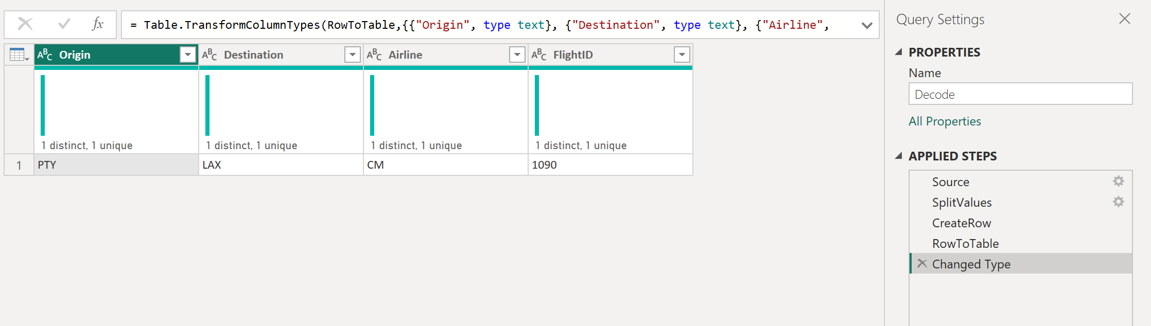 #"Changed Type" = Table.TransformColumnTypes(RowToTable,{{"Origin", type text}, {"Destination", type text}, {"Airline", type text}, {"FlightID", type text}})