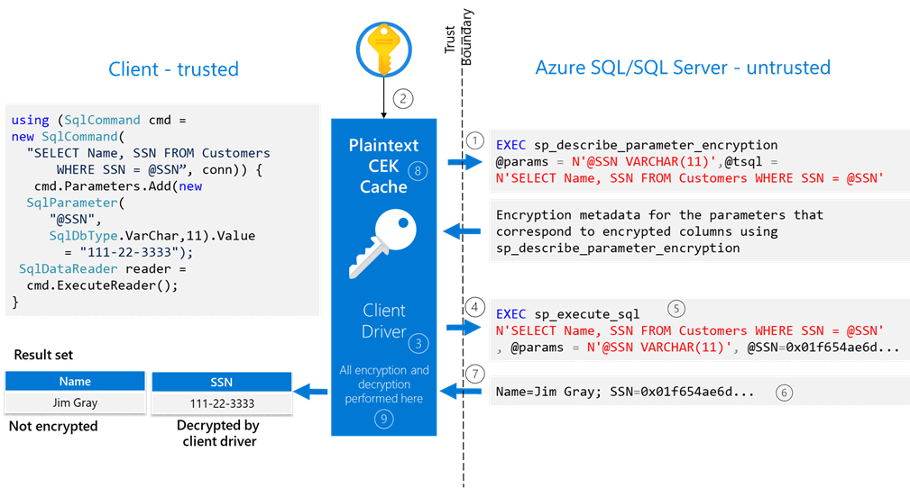 - 드라이버는 암호화된 열을 대상으로 하는 매개 변수의 일반 텍스트 값을 암호화된 값으로 대체하고 처리를 위해 쿼리를 데이터베이스 엔진으로 보냅니다.