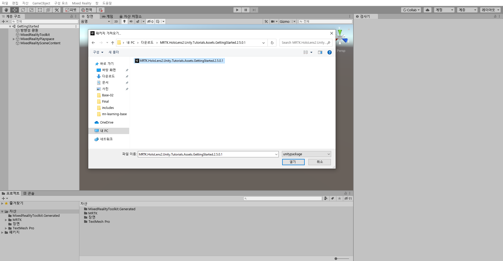 가져오기 패키지에서 다운로드한 MRTK.HoloLens2.Unity.Tutorials.Assets.GettingStarted.3.0.0 unitypackage를 선택한 다음 열기를 선택합니다.
