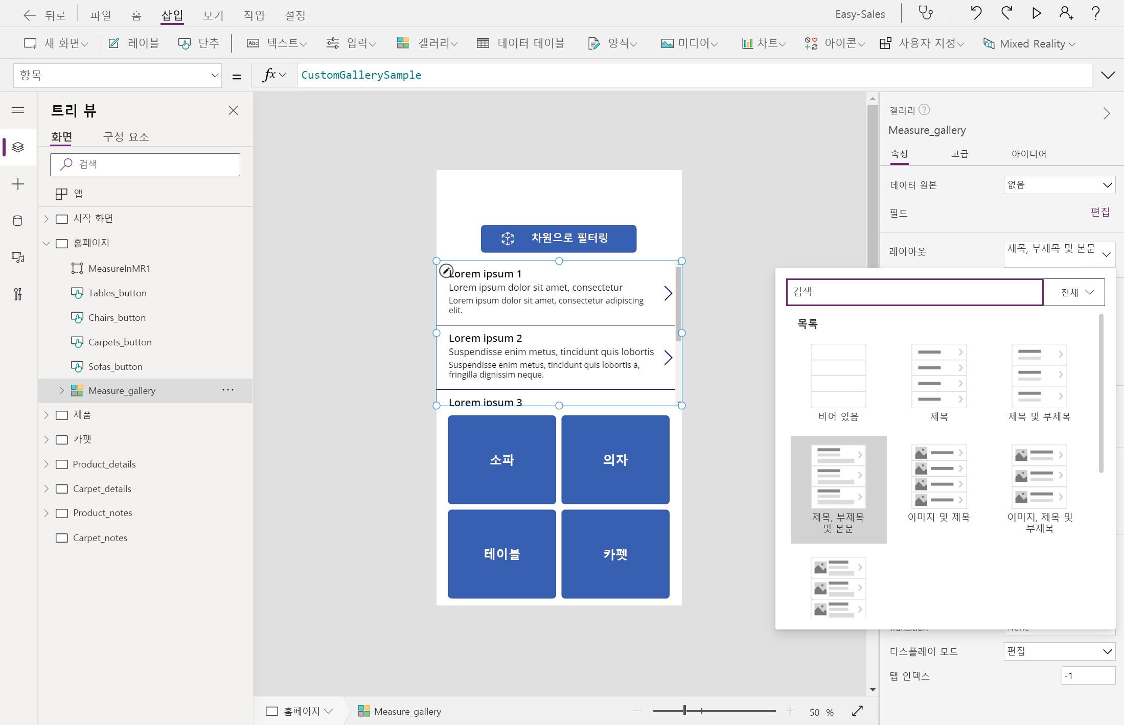 홈 페이지에서 갤러리>를 선택하여 갤러리를 추가합니다. 갤러리의 이름을 Measure_gallery 변경합니다.