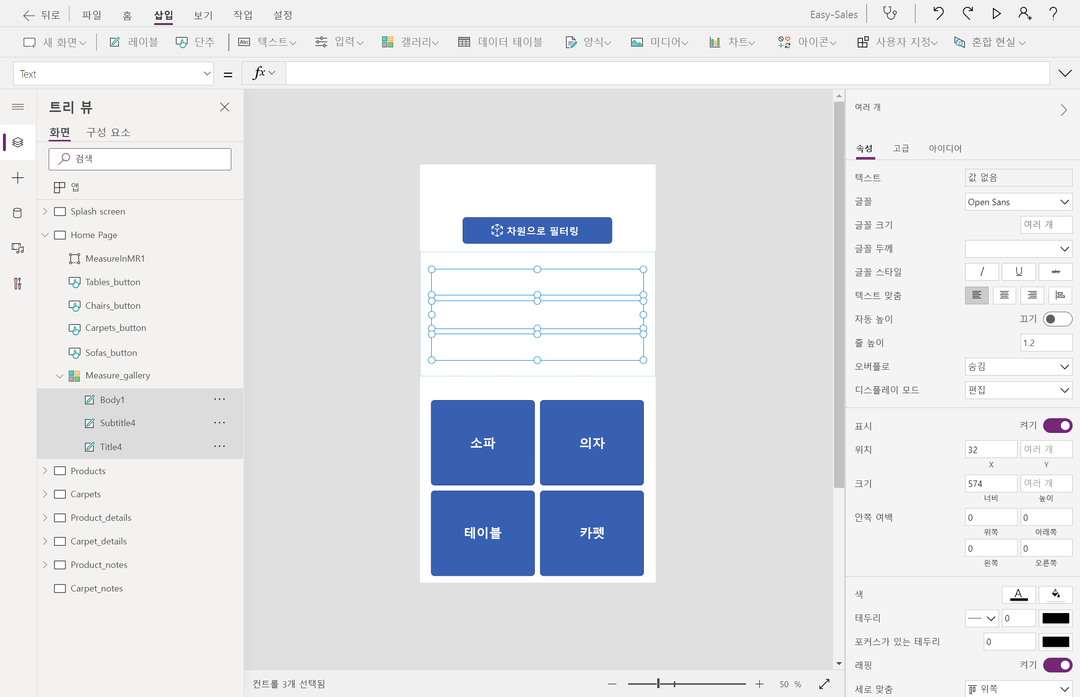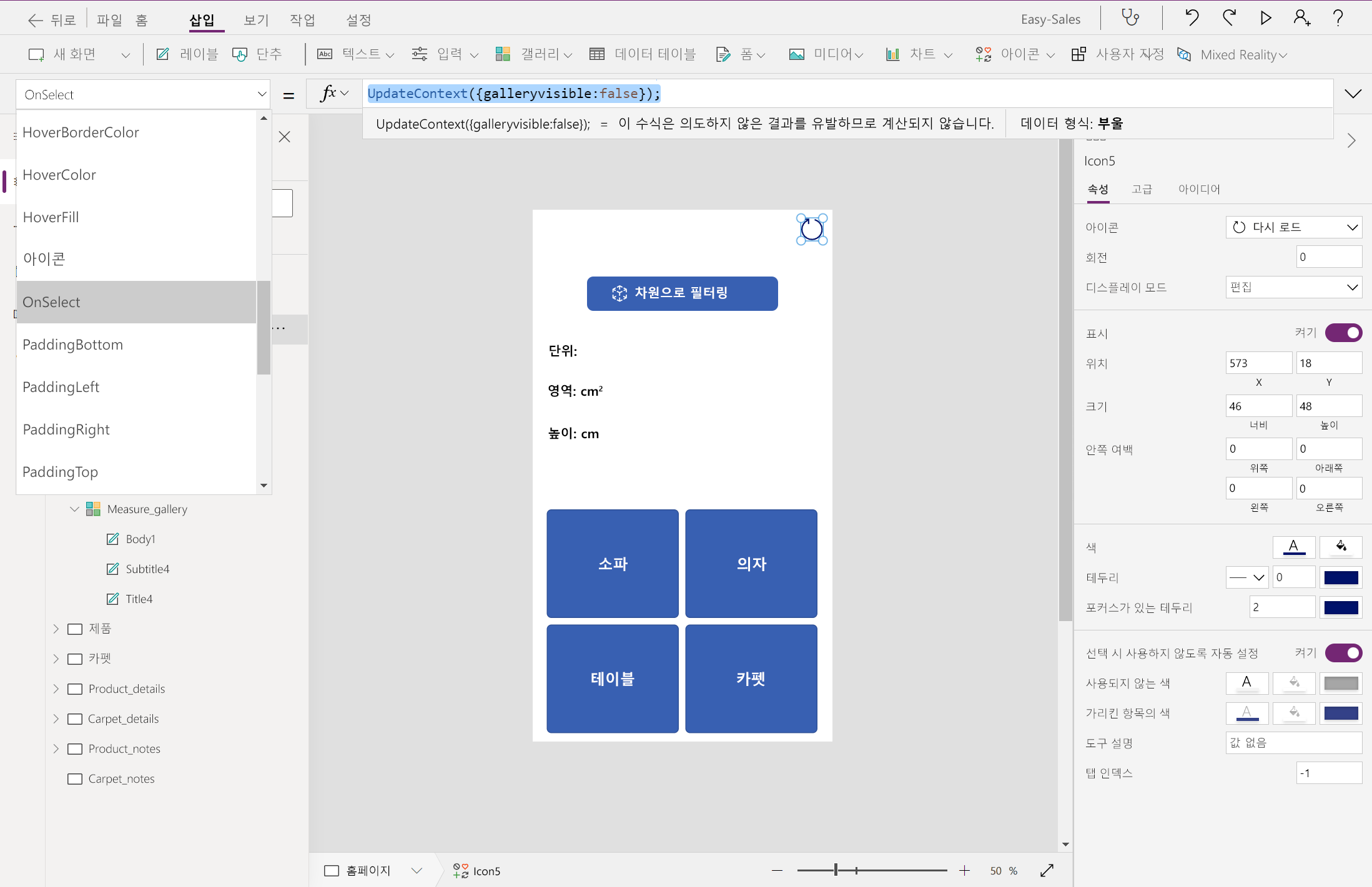 Measure_gallery.Selected.Area&"cm²"다음과 같이 가격 레이블 옆에 레이블을 구성하여 계산된 가격을 표시합니다.