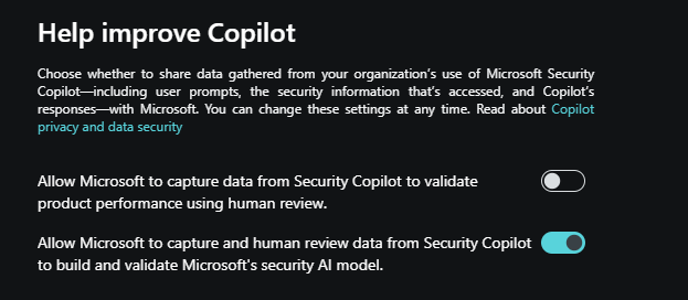 Microsoft가 Security Copilot에서 데이터를 캡처하여 인적 검토를 통해 제품 성능의 유효성을 검사할 수 있도록 허용합니다. 활성화하면 제품 개선을 위해 고객 데이터가 Microsoft와 공유됩니다. 올바른 플러그 인이 선택되었는지, 출력이 예상한 것과 같은지, 응답, 대기 시간 및 출력 형식을 어떻게 개선할 수 있는지 이해하기 위해 프롬프트와 응답을 평가합니다.