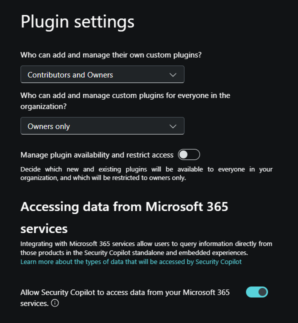 플러그 인 설정 - 관리자는 플러그 인을 관리하고 Security Copilot이 Microsoft 365 서비스의 데이터에 액세스할 수 있도록 허용할지 여부를 구성합니다. 이러한 설정은 작업 영역별로 구성됩니다.
