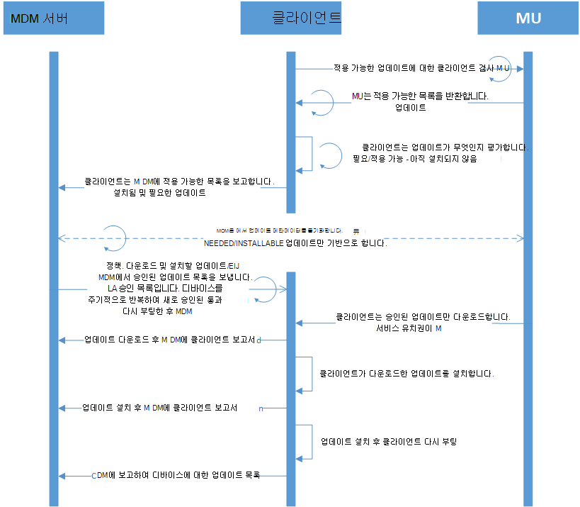 MDM은 OMA DM을 통해 업데이트를 관리할 수 있습니다. MDM을 사용하고 Windows OMA DM 프로토콜과 통합하는 방법과 MDM 관리를 위해 장치를 등록하는 방법에 대한 자세한 내용은 모바일 장치 관리에 설명되어 있습니다. 이 섹션에서는 업데이트 관리를 지원하기 위해 통합을 확장하는 방법을 중점적으로 설명합니다. 업데이트 관리의 주요 측면에는 다음 정보가 포함됩니다.