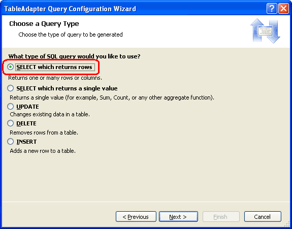 In het volgende scherm, weergegeven in afbeelding 4, vraagt de wizard ons welk type query moet worden toegevoegd. Omdat de GetProductsWithPriceQuartile methode alle kolommen en records uit de Products tabel retourneert, selecteert u de optie SELECT die rijen retourneert en klikt u op Volgende.