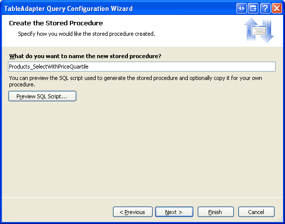 Een van de voordelen van het gebruik van opgeslagen procedures in plaats van ad-hoc SQL-instructies is dat het opnieuw uitvoeren van de wizard TableAdapter-configuratie de lijsten met opgeslagen procedures niet wijzigt. Controleer dit door met de rechtermuisknop op TableAdapter te klikken, de optie Configureren te kiezen in het contextmenu om de wizard te starten en vervolgens op Voltooien te klikken om deze te voltooien. Ga vervolgens naar de database en bekijk de Products_SelectWithPriceQuartile opgeslagen procedure. Houd er rekening mee dat de kolomlijst niet is gewijzigd. Als we ad-hoc SQL-instructies hadden gebruikt, zou het opnieuw uitvoeren van de wizard TableAdapter-configuratie deze querykolomlijst hebben teruggezet zodat deze overeenkomt met de kolomlijst van de hoofdquery. Daardoor zou de NTILE-instructie worden verwijderd uit de query die door de GetProductsWithPriceQuartile methode wordt gebruikt.