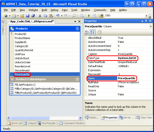 In de meeste scenario's retourneren alle methoden in een TableAdapter dezelfde set gegevensvelden, maar er zijn momenten waarop een bepaalde methode of twee mogelijk een extra veld moeten retourneren. In de zelfstudie Master-Detail met een opsomminglijst van hoofdrecords en een Details DataList hebben we bijvoorbeeld een methode toegevoegd aan de CategoriesTableAdapter, die naast de data velden van de hoofdquery, een NumberOfProducts-veld retourneerde waarin het aantal producten werd gerapporteerd dat aan elke categorie was gekoppeld. In deze zelfstudie hebben we gekeken naar het toevoegen van een methode in het ProductsTableAdapter veld dat naast de gegevensvelden van de hoofdquery een PriceQuartile veld heeft geretourneerd. Als u extra gegevensvelden wilt vastleggen die worden geretourneerd door de TableAdapter-methoden, moeten we overeenkomende kolommen toevoegen aan de gegevenstabel.