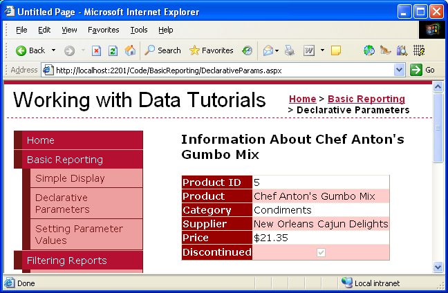 In deze zelfstudie laten we beginnen met het gebruik van een parameter die is ingesteld op een in code vastgelegde waarde. In het bijzonder kijken we naar het toevoegen van een DetailsView aan de pagina met informatie over een specifiek product, namelijk Chef Anton's Gumbo Mix, die een ProductID van 5 heeft. Vervolgens zien we hoe u de parameterwaarde instelt op basis van een webbesturing. In het bijzonder gebruiken we een tekstvak om de gebruiker te laten typen in een land/regio, waarna ze op een knop kunnen klikken om de lijst met leveranciers te zien die zich in dat land/regio bevinden.