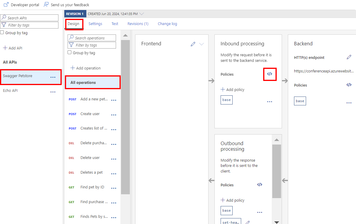 U kunt bijvoorbeeld een aangepaste antwoordheader instellen. Of beveilig uw back-end-API door een beleid voor frequentielimieten te configureren, zodat de API niet te veel wordt gebruikt door ontwikkelaars. Deze voorbeelden zijn een eenvoudige inleiding tot API Management-beleid. Zie API Management-beleid voor meer beleidsopties.