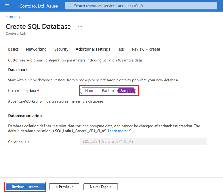 Selecteer op het tabblad Aanvullende instellingen in de sectie Gegevensbron de optie Bestaande gegevens gebruikenen kies Voorbeeld. Hiermee maakt u een AdventureWorksLT-voorbeelddatabase, zodat er enkele tabellen en gegevens zijn om query's op uit te voeren en te experimenteren, in plaats van een lege lege database.
