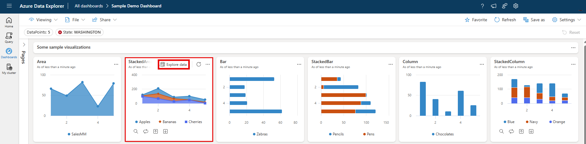 Zelfs als een dashboard met u wordt gedeeld en u alleen machtigingen voor de kijker hebt, kunt u het nog steeds verkennen. Het verkenningsproces begint met het weergeven van de gegevens en de bijbehorende visualisatie zoals deze op de tegel worden weergegeven. Van daaruit kunt u de gegevens verder verkennen door filters en aggregaties toe te voegen of te verwijderen en uw resultaten te bekijken met behulp van verschillende visualisaties, allemaal zonder enige kennis van de Kusto-querytaal.