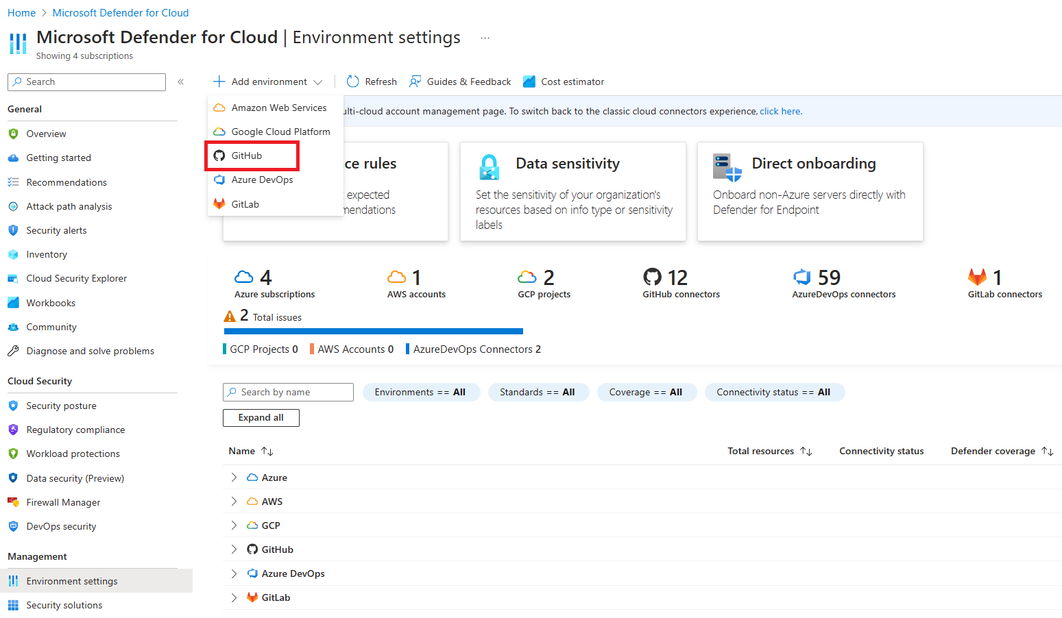 Door uw GitHub-omgevingen te verbinden met Defender voor Cloud, kunt u de beveiligingsmogelijkheden van Defender voor Cloud uitbreiden naar uw GitHub-resources en de beveiligingspostuur verbeteren. Meer informatie.
