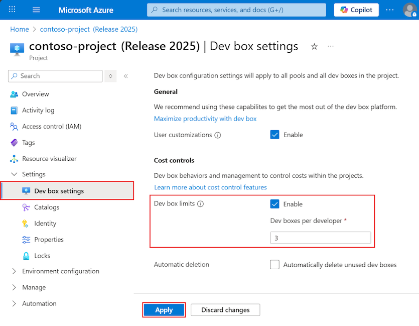 Configureer de limieten voor dev-box op de pagina Dev Box-instellingen onder Kostenbesturingselementen: