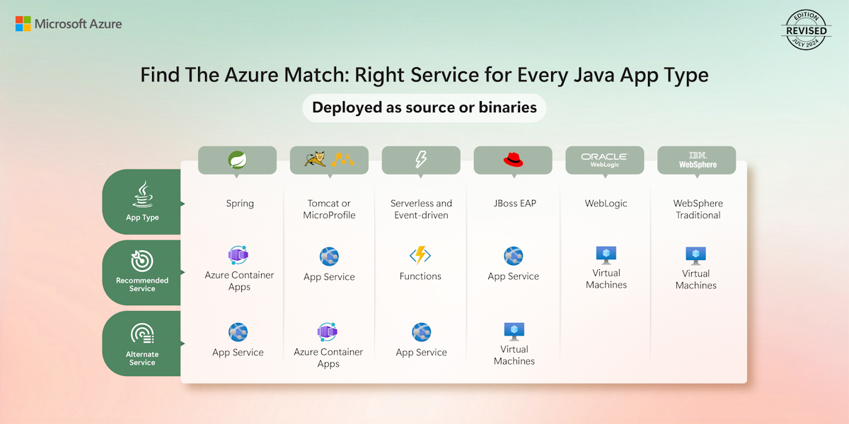 Diagram met aanbevolen Azure-services voor elk Java-toepassingstype dat is geïmplementeerd als bron- of binaire bestanden.