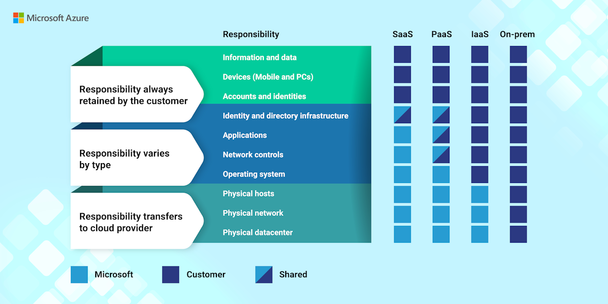 Diagram met een tabel met het model voor gedeelde verantwoordelijkheid tussen de klant en de cloudprovider.