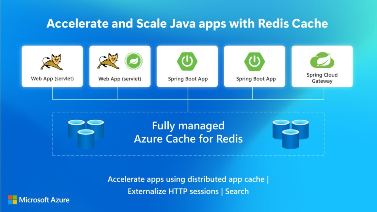 Naarmate de workloads voor uw Java-toepassingen toenemen, kunt u de prestaties verbeteren met behulp van Azure Cache voor Redis om een cachelaag in het geheugen te implementeren voor queryresultaten, sessiestatussen en statische inhoud. Het is een uitstekende manier om de doorvoer van toepassingen te verbeteren en latentie te verminderen zonder dat u de onderliggende database opnieuw hoeft te ontwerpen. Azure Cache voor Redis Enterprise-lagen, ontwikkeld in samenwerking met Redis en volledig beheerd door Microsoft, is de meest beschikbare en schaalbare implementatieoptie voor het uitvoeren van Redis in Azure, waaronder functies zoals actieve geo-replicatie, extern sessiebeheer en snelle zoek- en indexering.