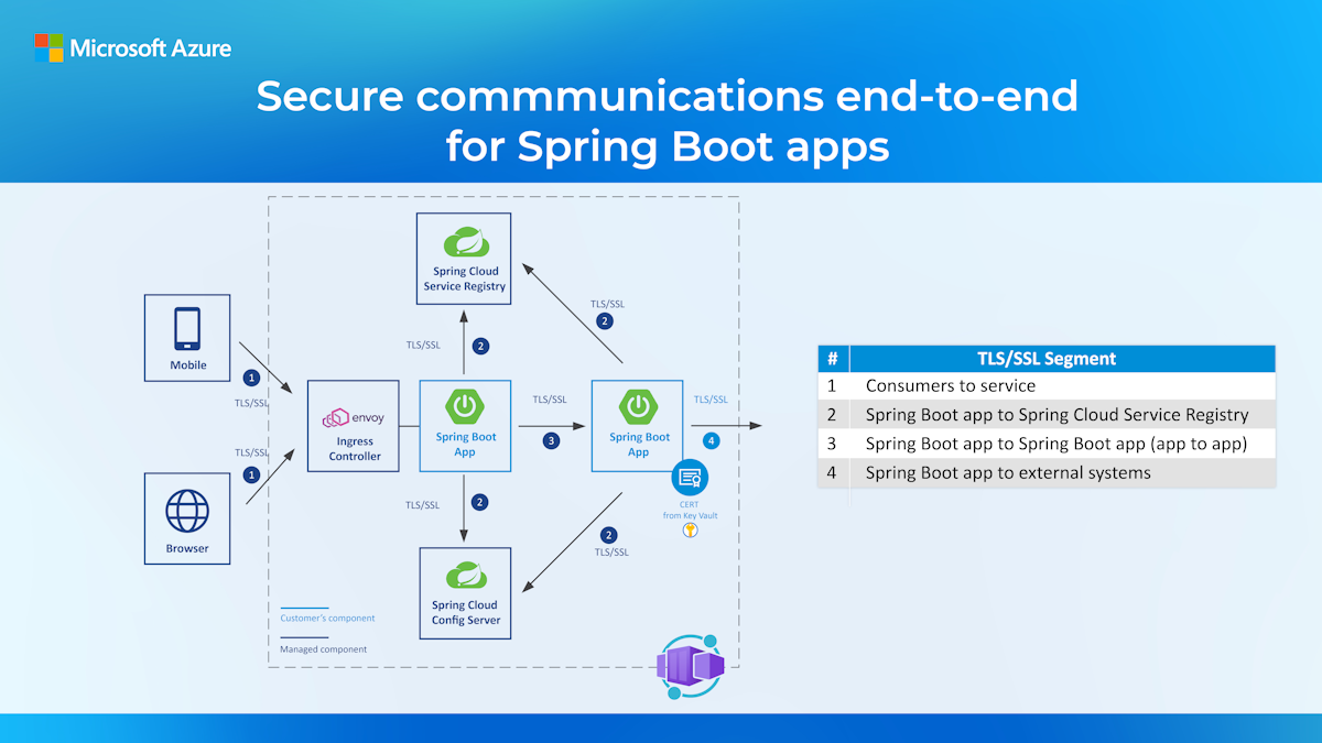 Diagram van de architectuur voor beveiligde end-to-end-communicatie voor Spring Boot-apps.