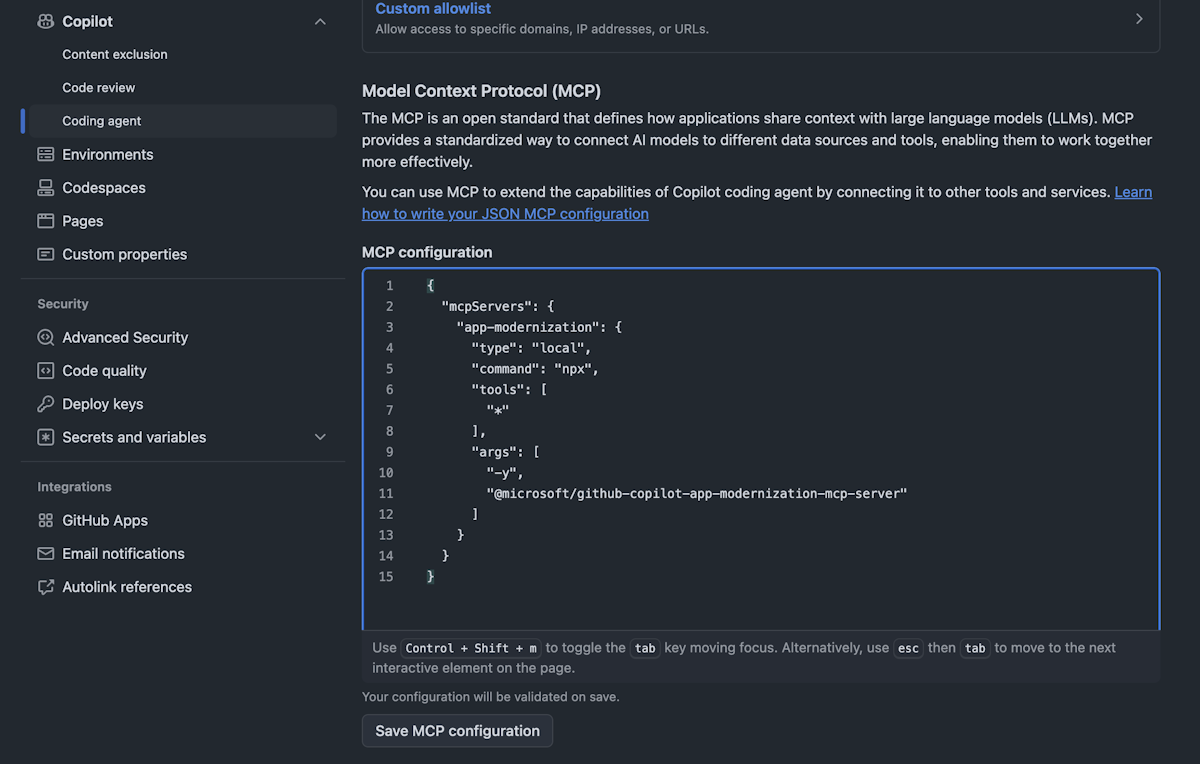 { "mcpServers": { "app-modernization": { "type": "local", "command": "npx", "tools": [ "*" ], "args": [ "-y", "@microsoft/github-copilot-app-modernization-mcp-server" ] } } }(Optioneel) Als omgevingsvariabelen vereist zijn, stelt u deze in onder Environment>Copilot in de instellingen. Deze omgevingsvariabelen worden automatisch geïnitialiseerd wanneer een gebruiker voor het eerst een agentische taak aanroept in deze opslagplaats.