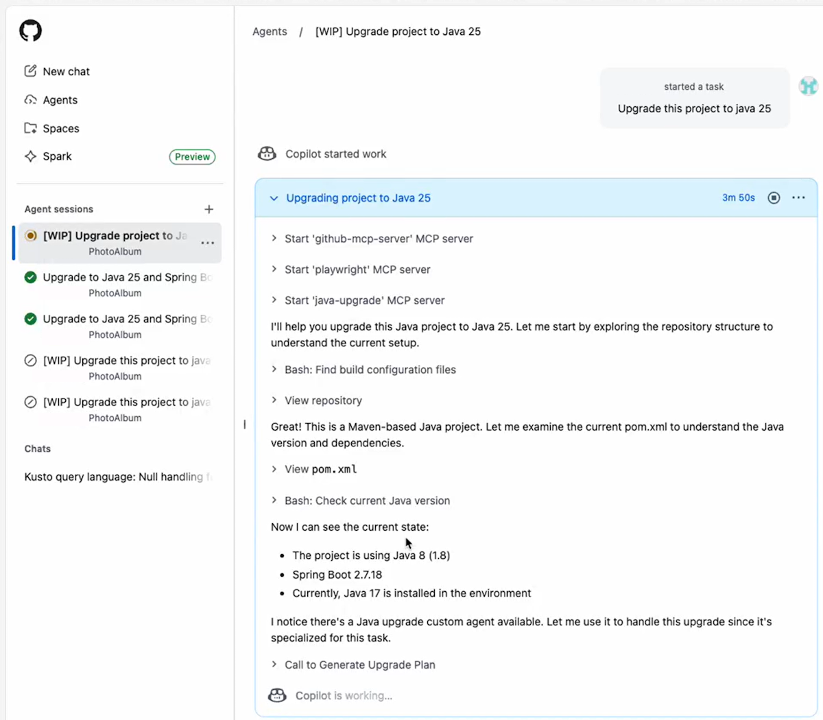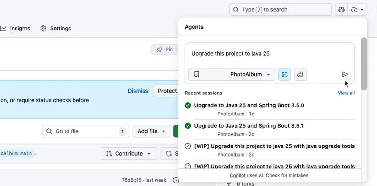 Dit artikel bevat een overzicht van hoe Java-ontwikkelaars hun toepassingen kunnen moderniseren met behulp van de modernisering van gitHub Copilot-apps binnen de Copilot-coderingsagent. De agent kan onafhankelijk op de achtergrond werken om moderniseringstaken uit te voeren, net als een menselijke ontwikkelaar. Ontwikkelaars kunnen taken delegeren via problemen of pull-aanvragen, en de agent voert ze uit in de cloud, zodat teams het volledige moderniseringstraject efficiënt kunnen voltooien.