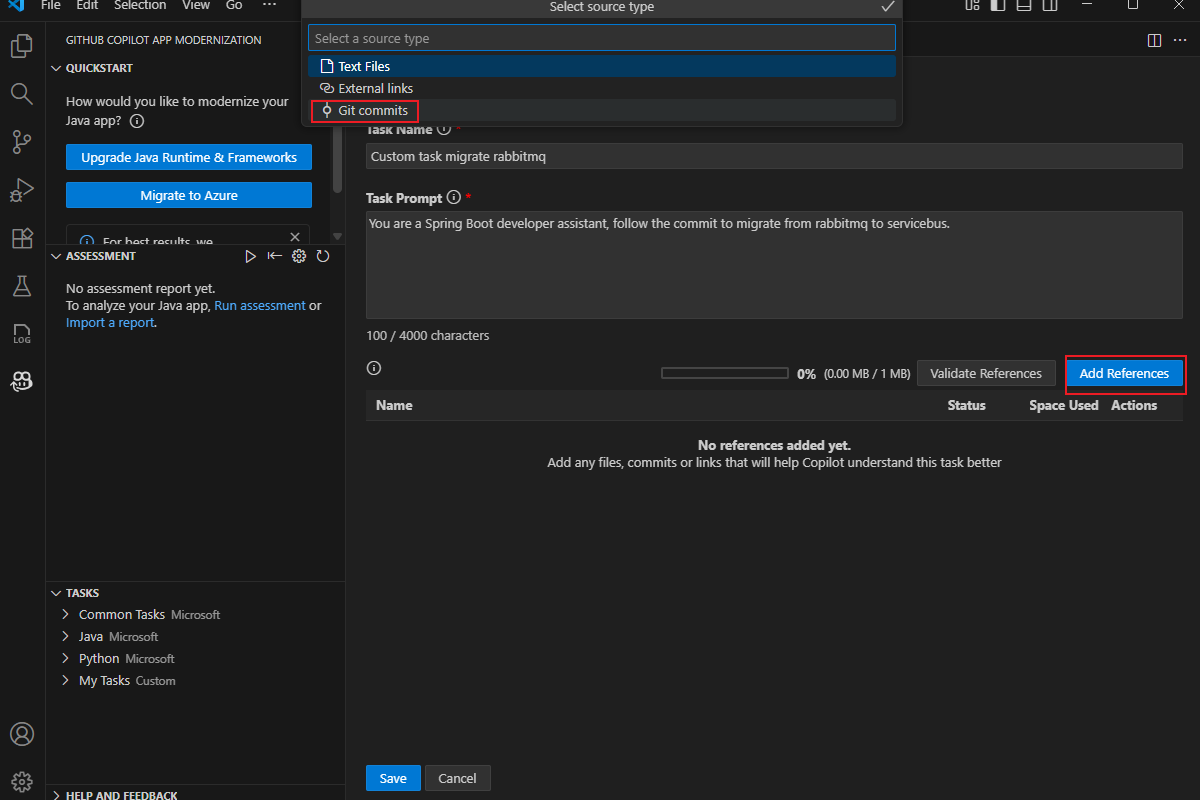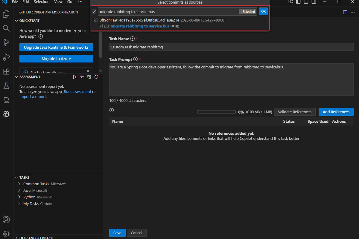 task.mdbestand geopend. Voer in het veld TaaknaamAangepaste taak rabbitmq migreren in. Voer in het veld Taakprompt in: U bent een Spring Boot-ontwikkelaarsassistent, volg de commit om te migreren van RabbitMQ naar Service Bus.Selecteer Verwijzingen toevoegen en selecteer vervolgens Git commits in het pop-updialoogvenster.