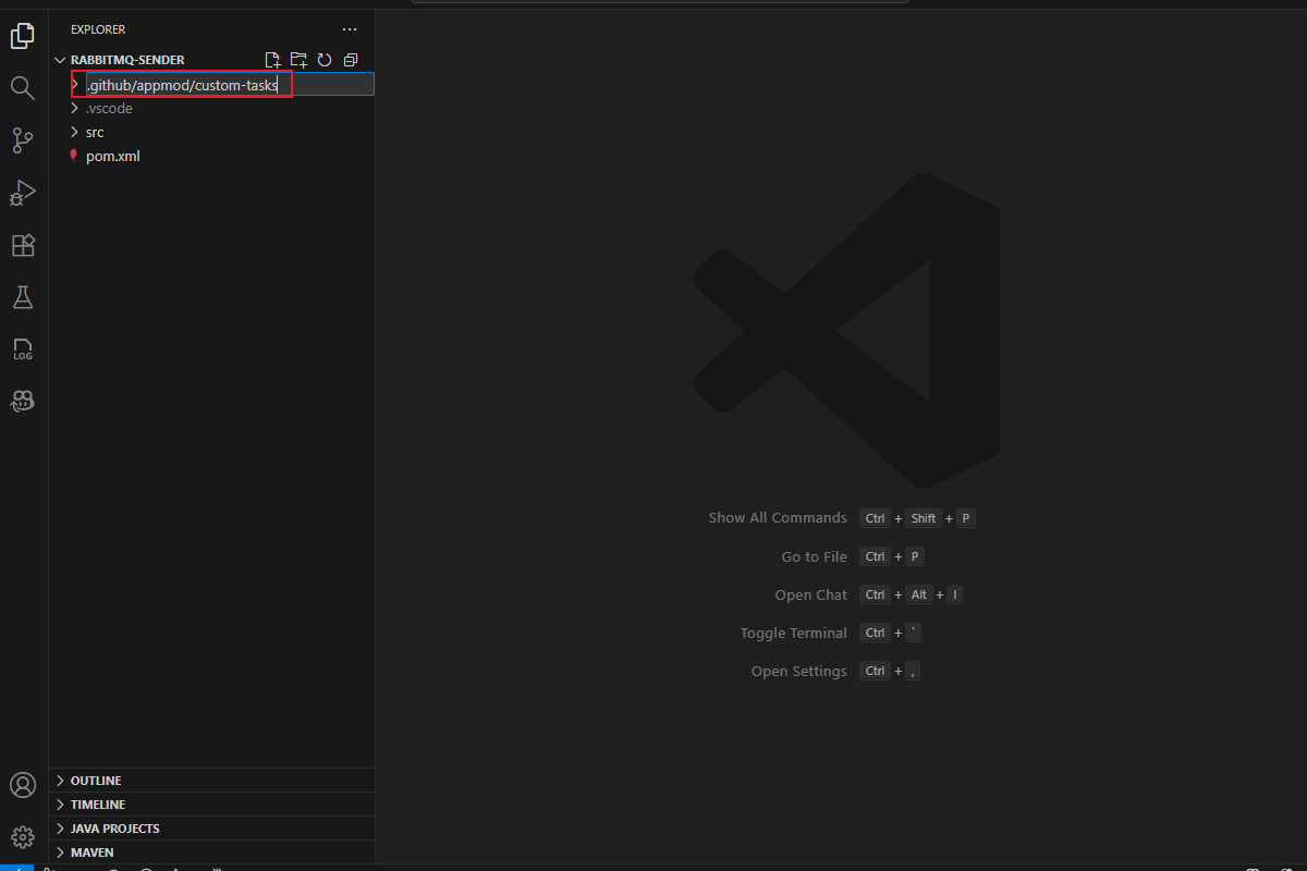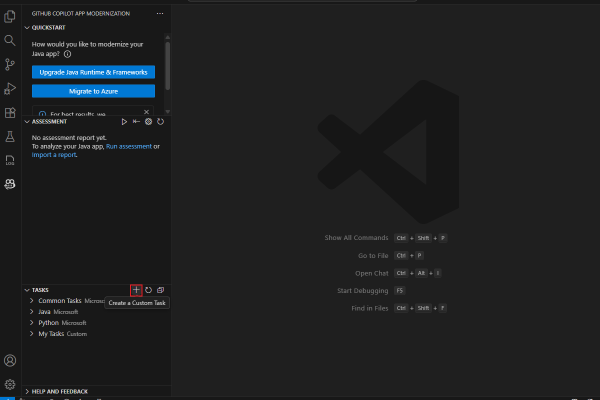 rabbitmq-senderprojectmap vanuit de gekloonde opslagplaats. Schakel vervolgens over naar de bronvertakking.Open in de zijbalk Activiteit het deelvenster modernisering van de GitHub Copilot-app , beweeg de muisaanwijzer over de sectie TAKEN en selecteer vervolgens Een aangepaste taak maken.