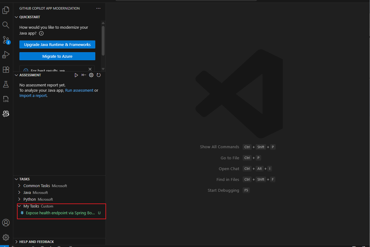 task.mdbestand door de vooraf gedefinieerde stappen in de moderniseringsextensie van de GitHub Copilot-app te volgen.Voer in het geopende