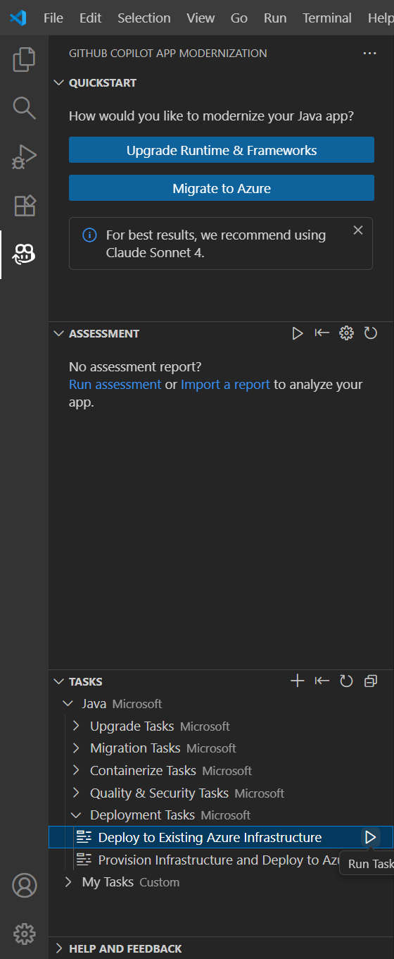 Open Java in de sectie Taken, open Vervolgens Implementatietaken en selecteer Implementeren naar bestaande Azure-infrastructuur of Infrastructuur inrichten en implementeren in Azure.