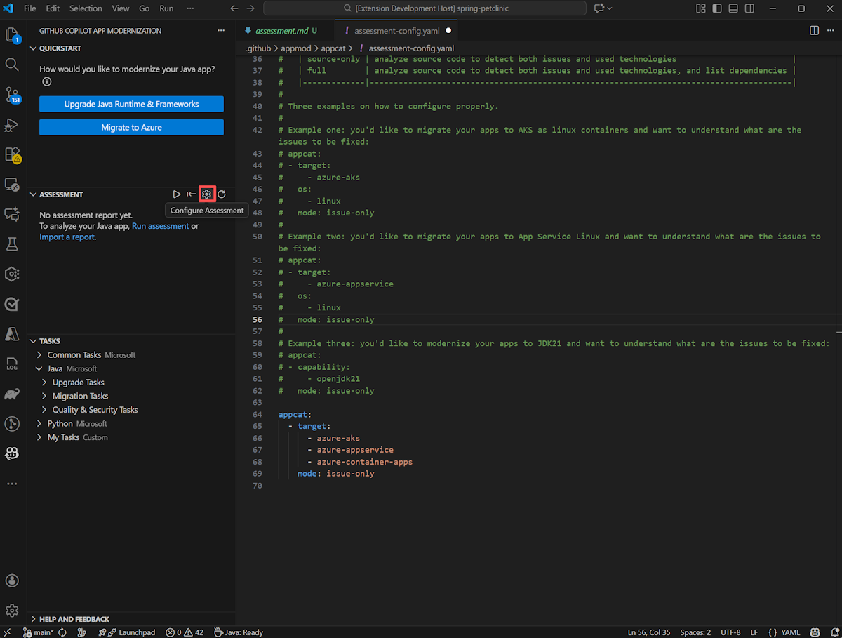 appcat: - target: - azure-appservice os: - linux mode: issue-onlyVoorbeeld drie: u wilt uw apps moderniseren naar JDK21 en wilt weten wat de problemen zijn die moeten worden opgelost. Gebruik de volgende configuratie: