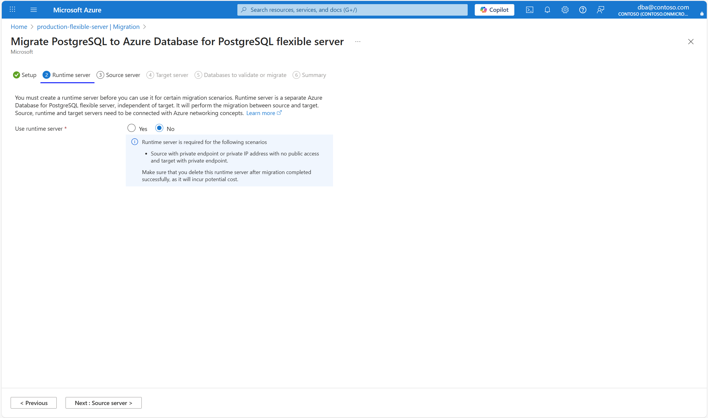 De migratieruntimeserver is een gespecialiseerde functie binnen de migratieservice in Azure Database for PostgreSQL, ontworpen om tijdens de migratie als een tussenliggende server te fungeren. Het is een afzonderlijk exemplaar van een flexibele Azure Database for PostgreSQL-server dat niet de doelserver is, maar wordt gebruikt om de migratie van databases vanuit een bronomgeving te vergemakkelijken die alleen toegankelijk is via een particulier netwerk.