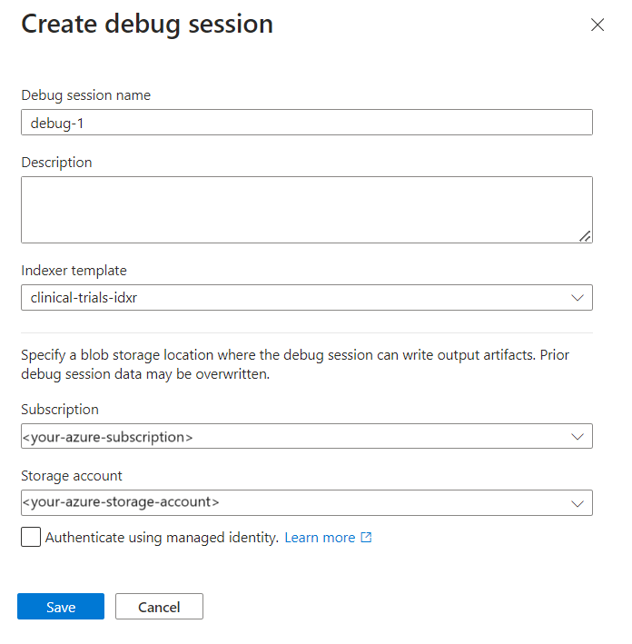 Er wordt een foutopsporingssessie geopend op de pagina Instellingen. U kunt wijzigingen aanbrengen in de eerste configuratie en eventuele standaardinstellingen overschrijven. Een foutopsporingssessie werkt alleen met één document. De standaardinstelling is om het eerste document in de verzameling te accepteren als basis voor uw foutopsporingssessies. U kunt een specifiek document kiezen om fouten op te sporen door de URI ervan op te geven in Azure Storage.