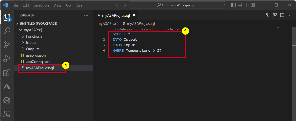 Er wordt een ASA-project toegevoegd aan uw werkruimte. Het bestaat uit drie mappen: Invoer, Uitvoer en Functies. Het bevat ook het queryscript (*.asaql), het bestand JobConfig.json en het configuratiebestand asaproj.json.